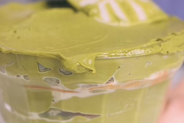 - Siapkan wadah saji atau cup dessert, masukkan sebagian adonan telur matcha ke dasar wadah.