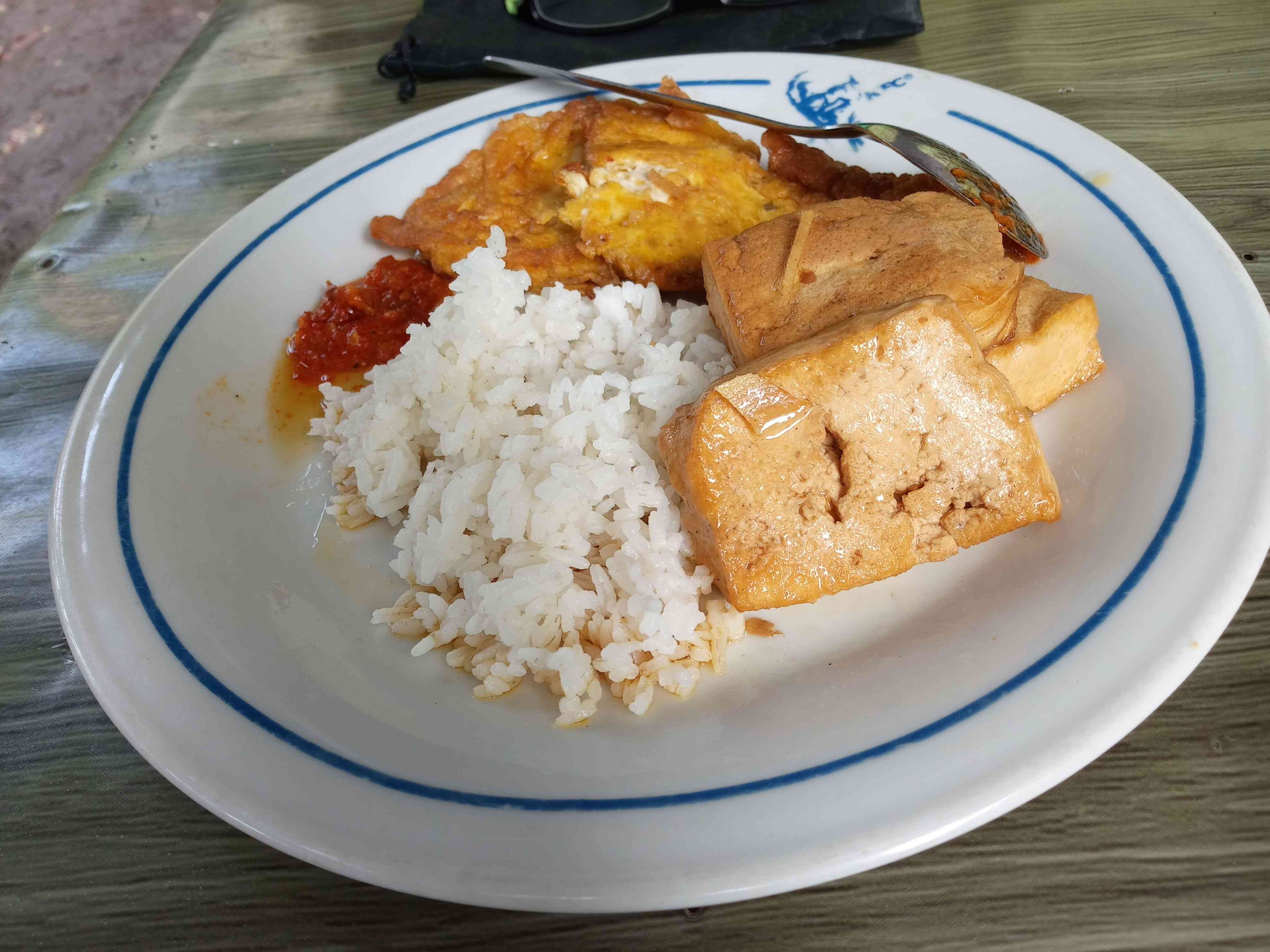 Saya tidak lagi memberikan pendapat. Dengan sedikit melanggar aturan pembatasan makanan, saya memesan sedikit nasi, tahu dengan kuah, telur goreng, dan sambal. Tidak ada pilihan sayur di etalase, bahkan mentimun atau tomat pun tidak tersedia.